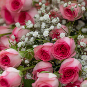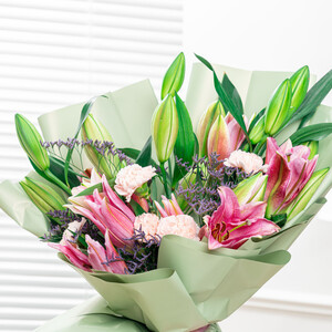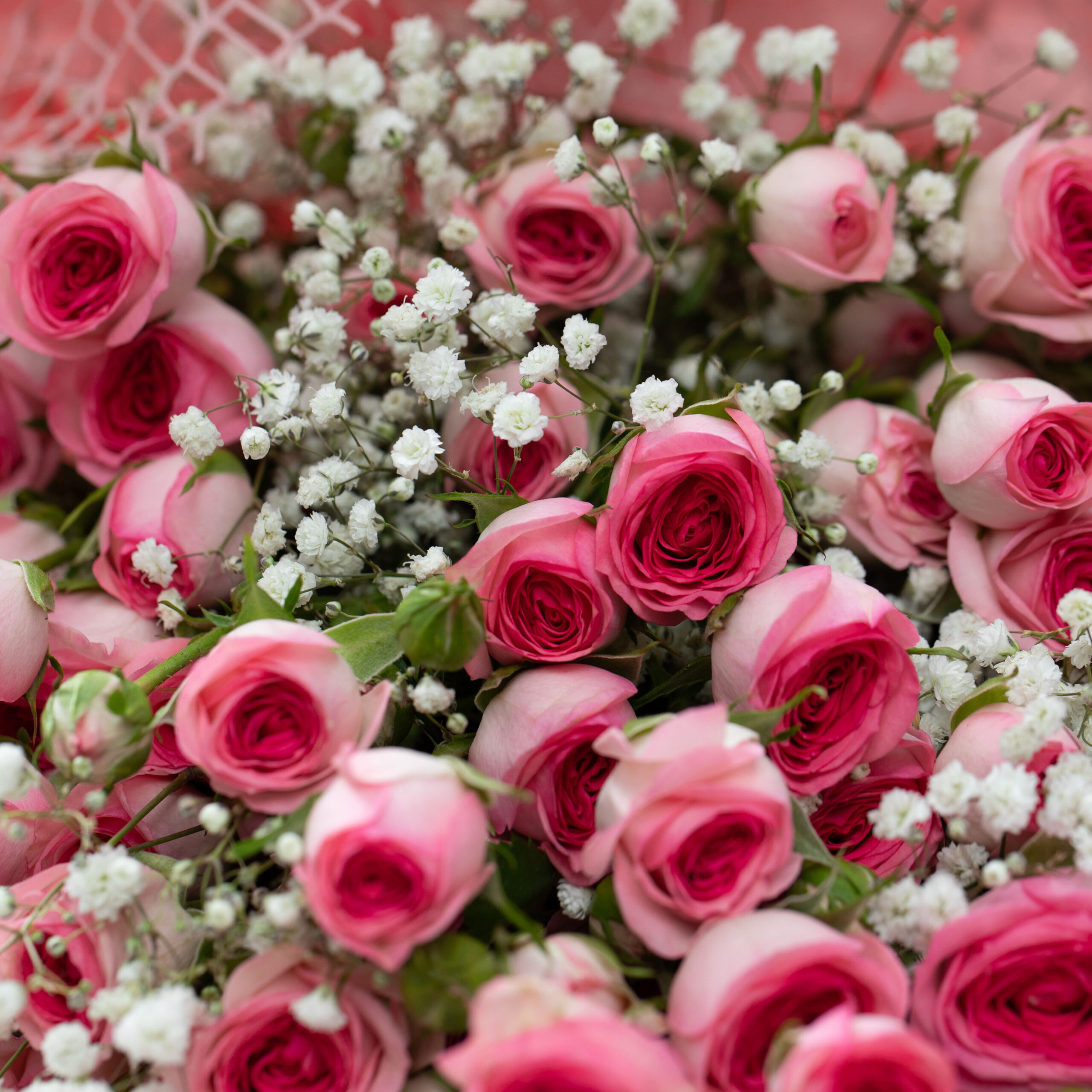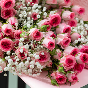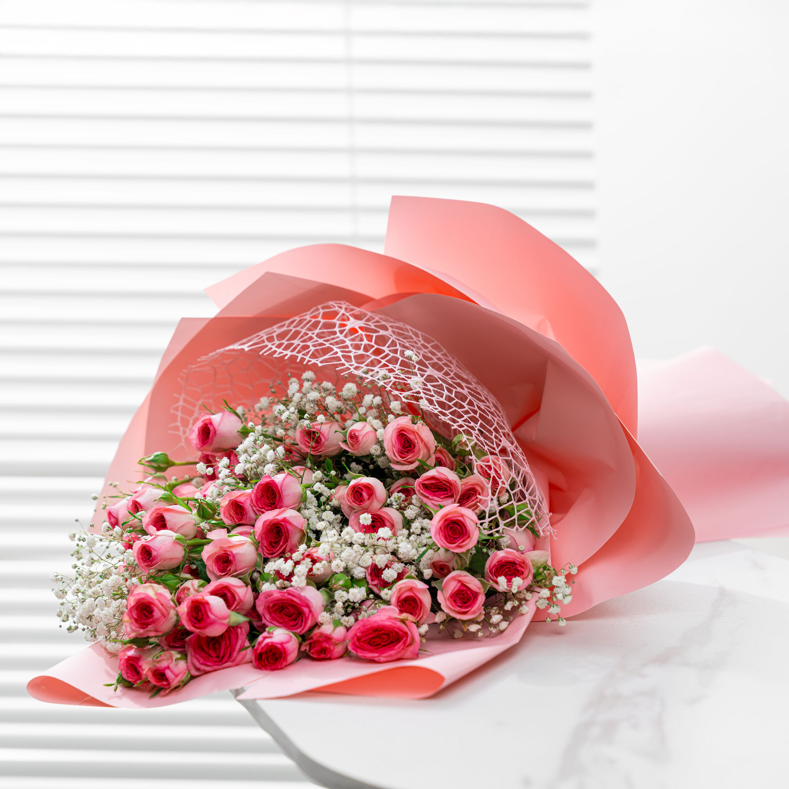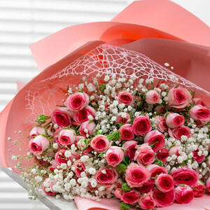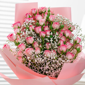 The Blush Bouquet by Rozitana features 10 baby pink roses delicately arranged with 10 white gypsophila, wrapped in a soft pink and white design.
