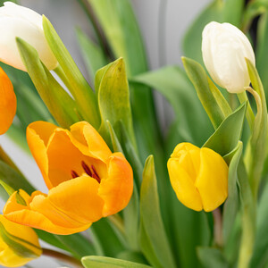 It features 18 fresh tulips—6 orange, 6 white, and 6 yellow—beautifully arranged with 8 green steel grass stems and 2 green foliage accents,