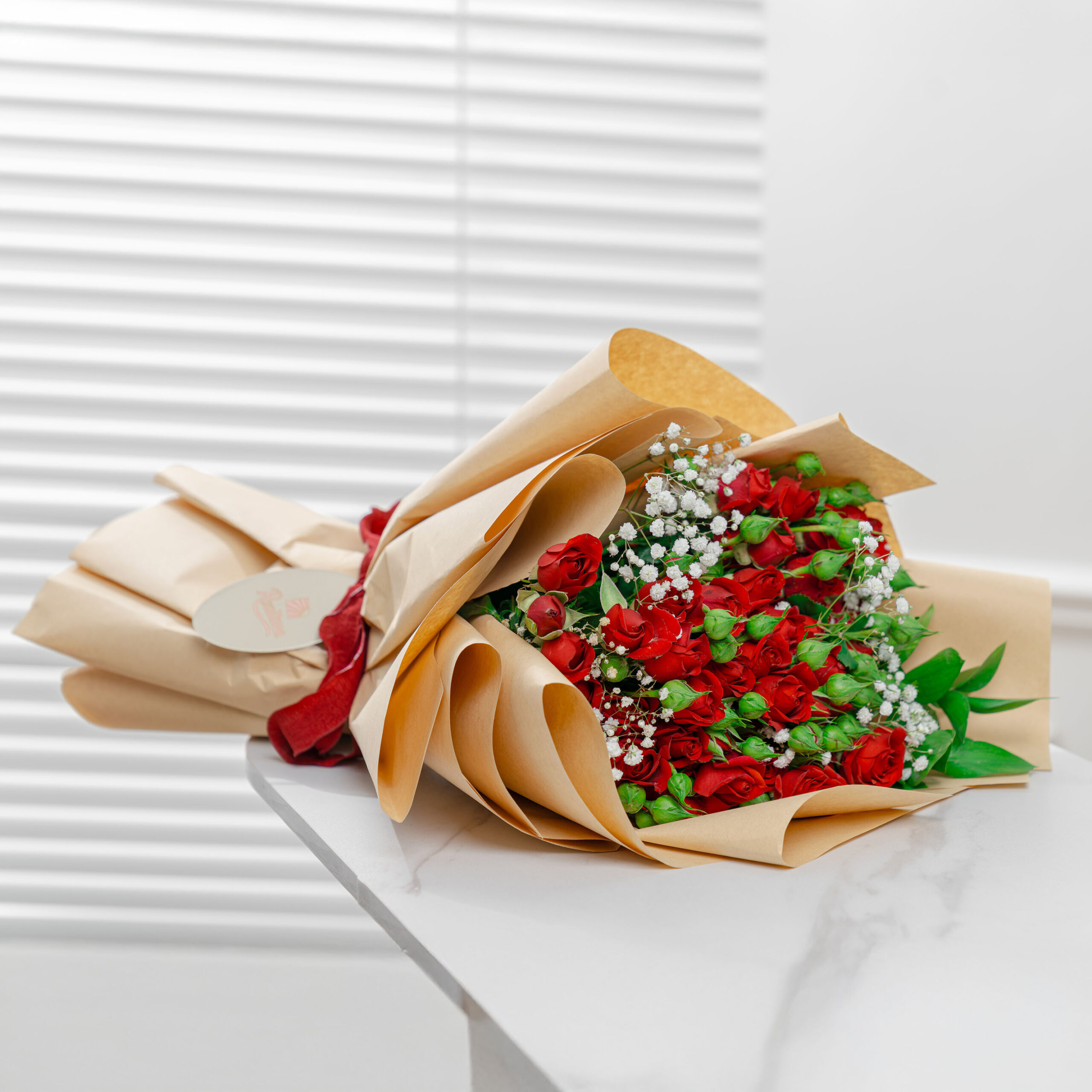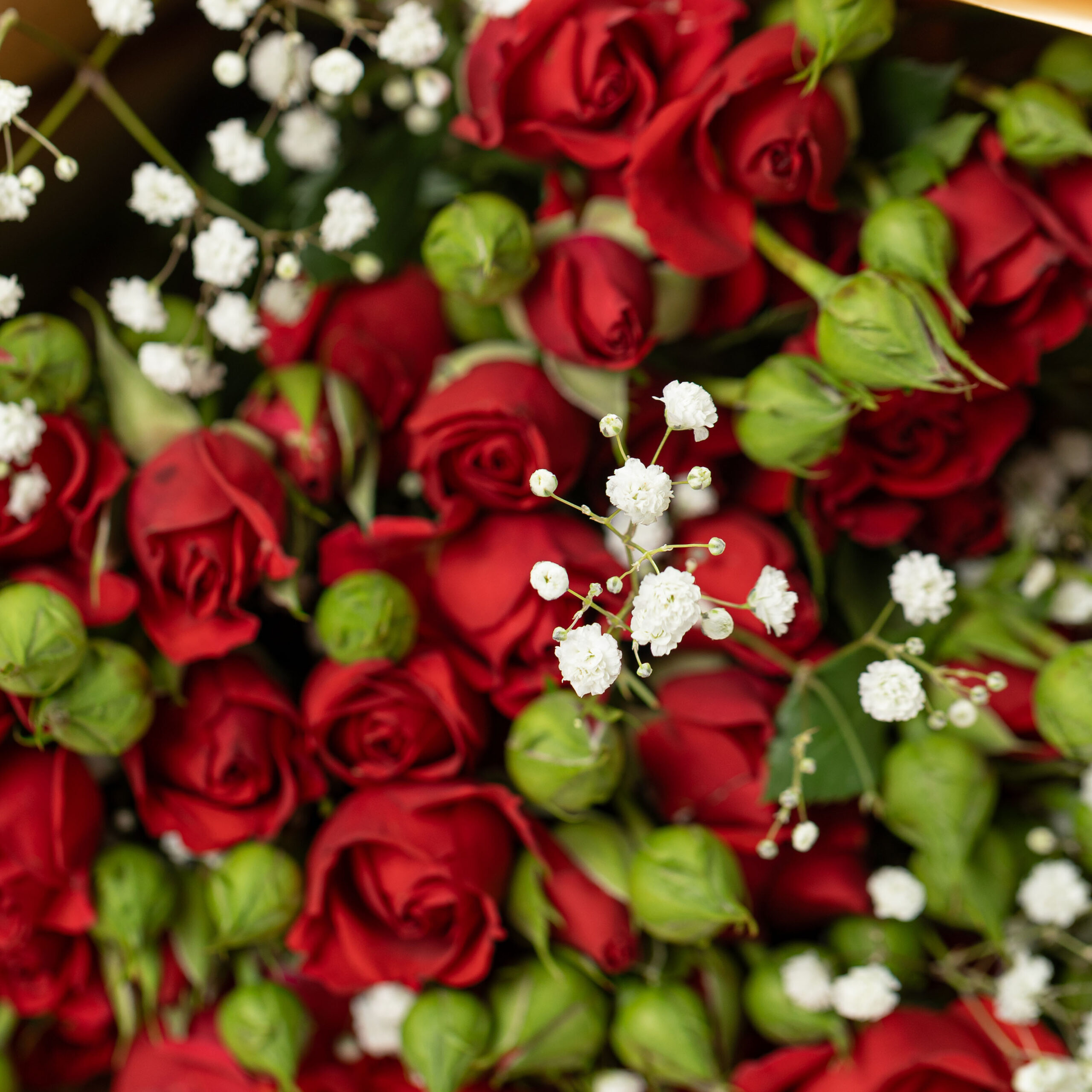 It features The Old Fashioned Bouquet, a timeless arrangement of 10 red baby roses, accented with 3 white gypsophila and 2 green ruscus, finished