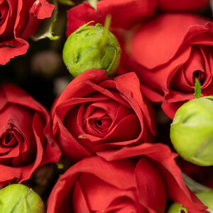 Flowers: 10 red baby roses, 3 gypsophila, 2 ruscus