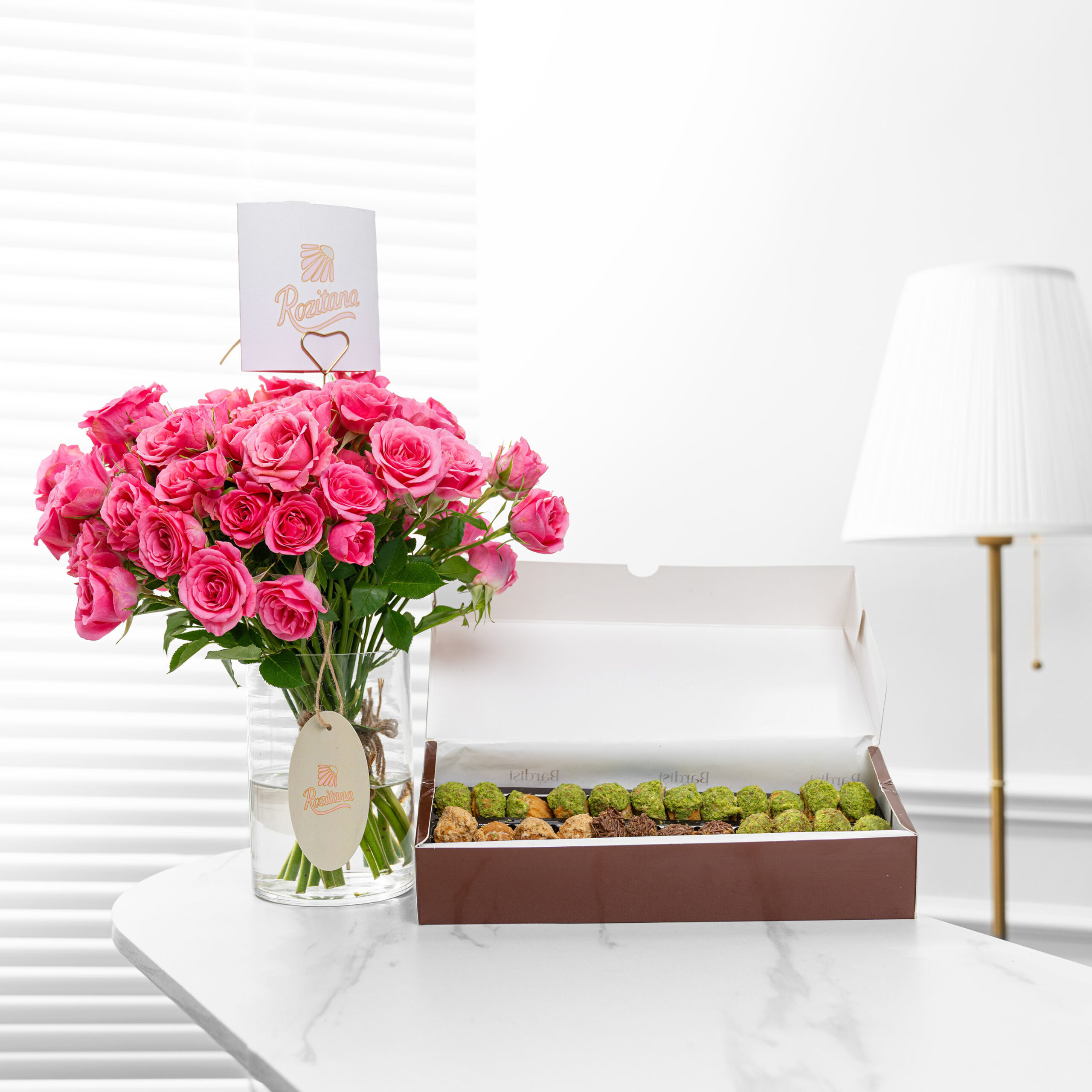 The Pinkish × Al-Bardisi set from Rozitana is a refined pairing of soft florals and artisanal sweets, designed for elegant and thoughtful gifting.