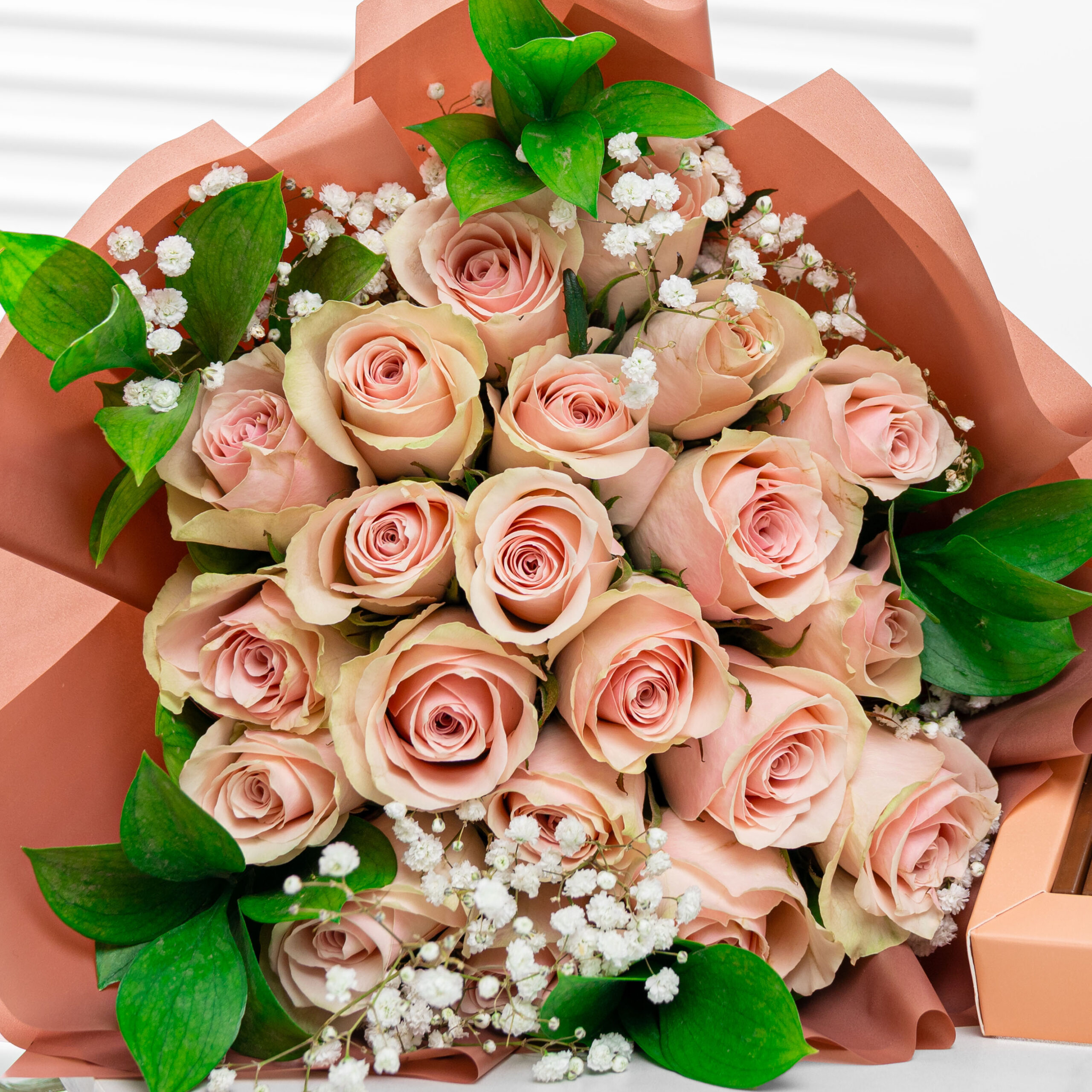 It features the Rory Bouquet, a graceful arrangement of 20 pink roses, delicately accented with 4 white gypsophila and 5 green ruscus for a soft, fresh,