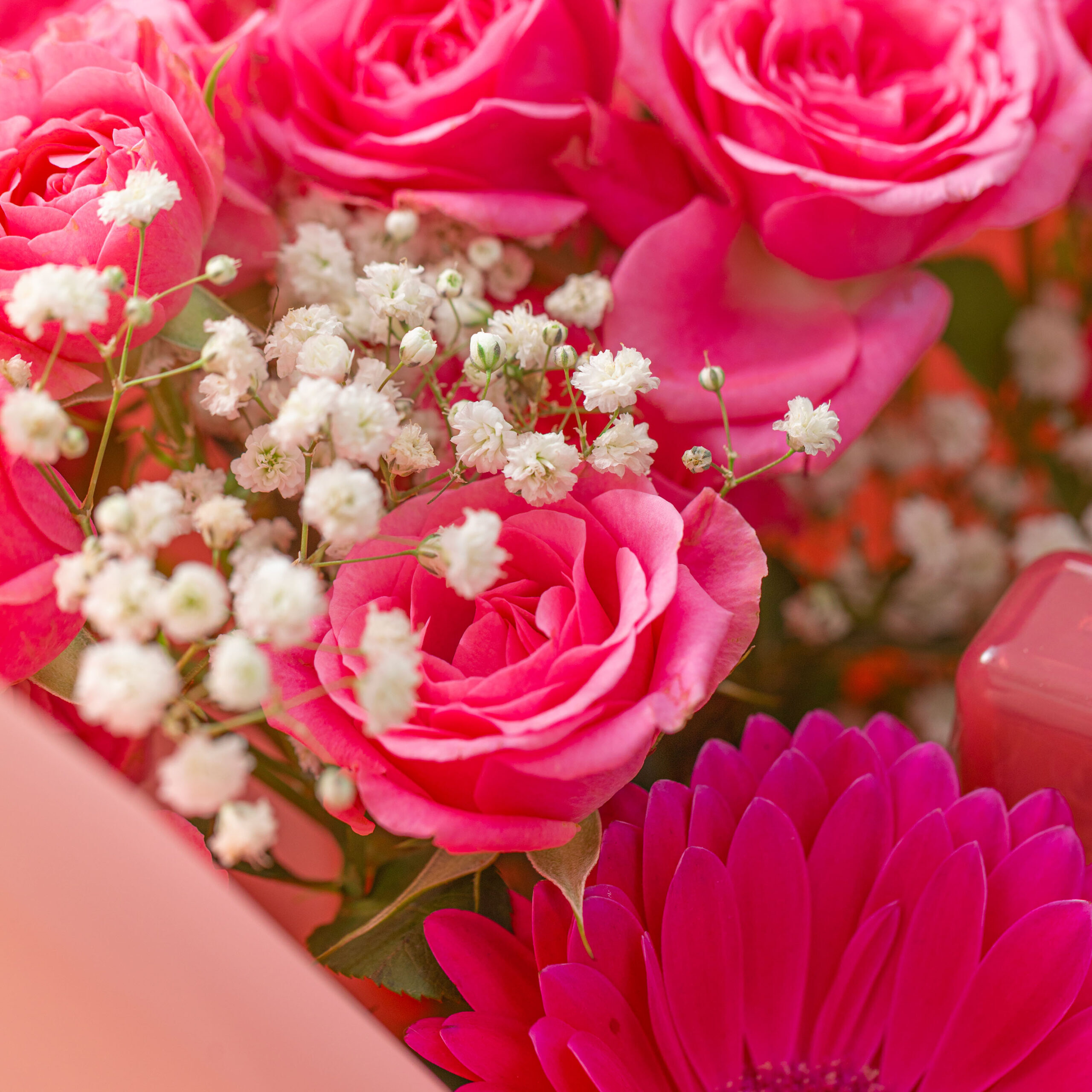 It features 4 fuchsia baby roses, 2 fuchsia gerbera, 1 white gerbera, and 5 white gypsophila, beautifully wrapped in a refined pink cover and finished