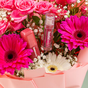 with a matching pink ribbon, paired with Huda Beauty Lip Oil and Huda Beauty Blusher for a complete luxury beauty touch.