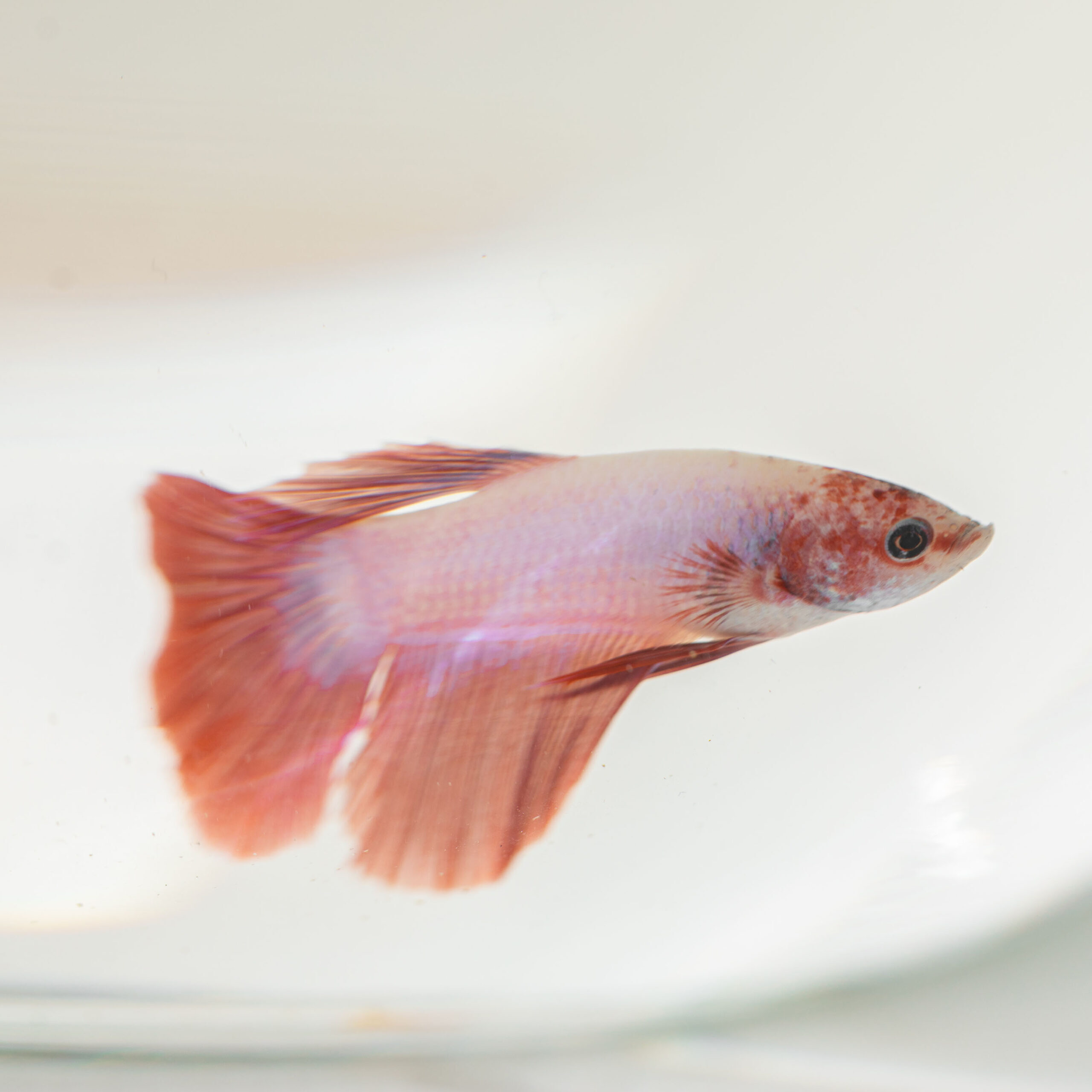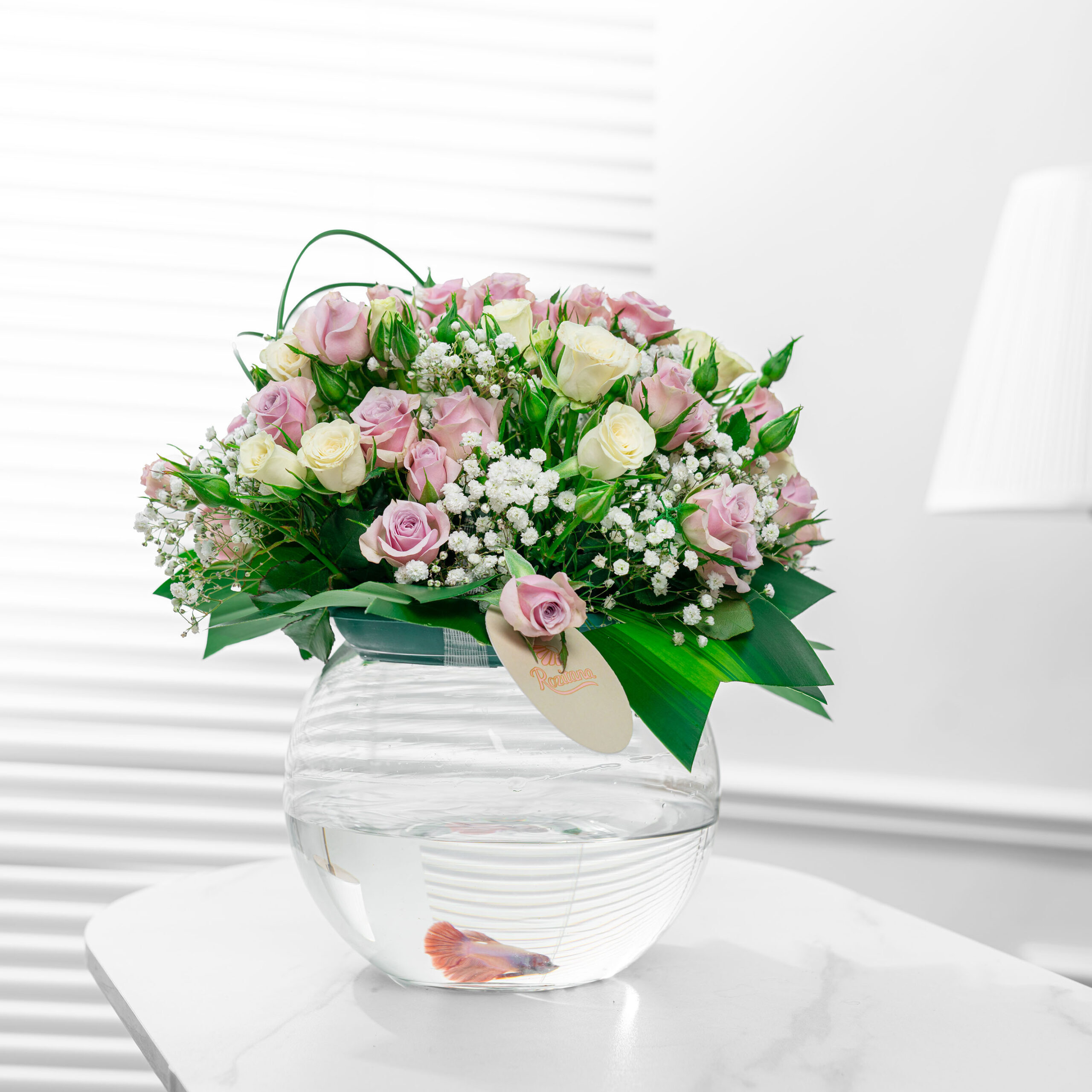 It features a mauve Betta fish (Fighter fish) in a clear glass bowl (20 cm diameter), accented with 6 mauve baby roses, 6 white baby roses, 3 white